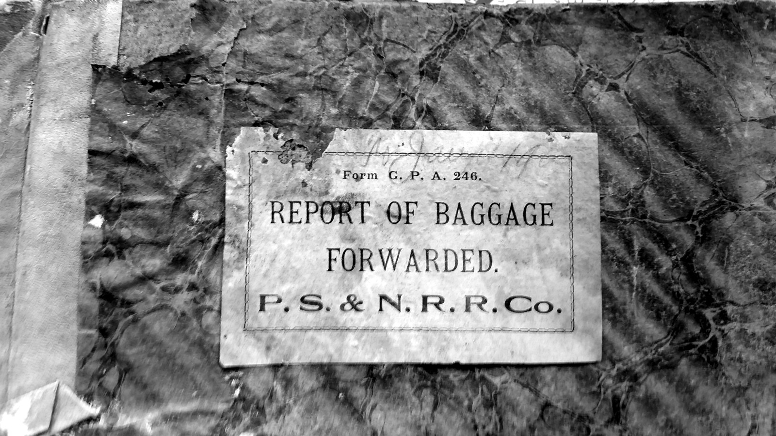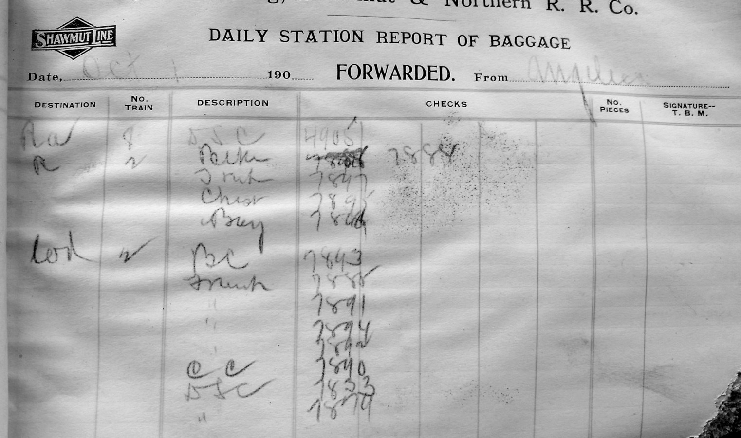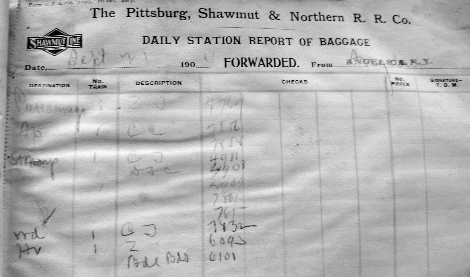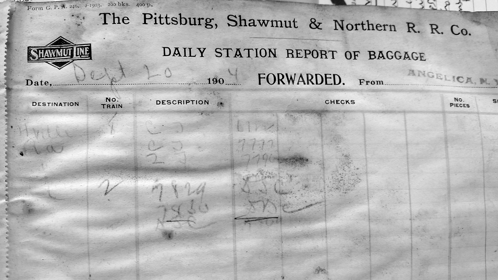 What Randy had in hand came from the Angelica, NY depot ranging from 1904-05. It is a daily logbook of checked baggage on passenger trains. When passengers would check baggage at the depot to have it transported in the baggage car, a claim check/receipt was is-sued to the customer with a pre-printed four-digit number on it. These transactions were then logged in this book.